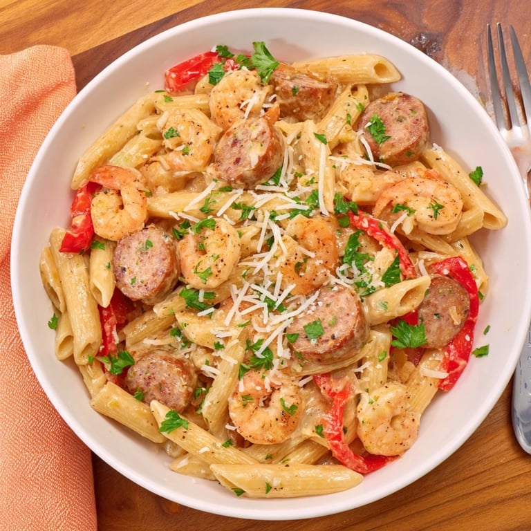 Save A creamy, spicy one-pan pasta featuring smoky sausage, succulent shrimp, and a rich Cajun Alfredo sauceperfect for weeknight comfort.