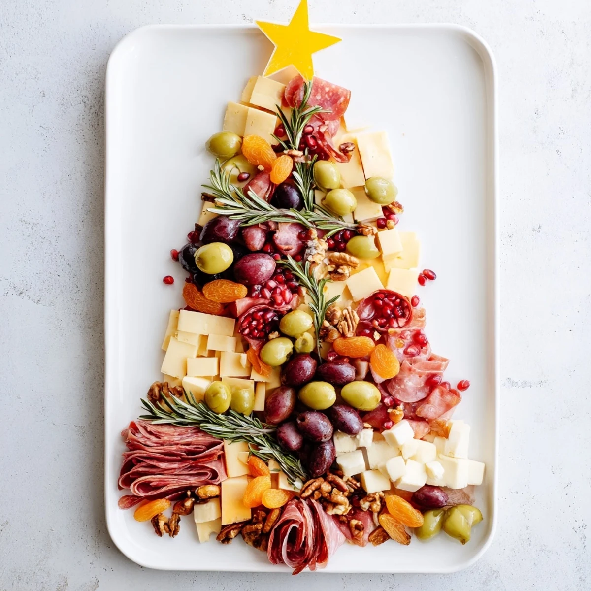 Layer meats, cheeses, fruits, and accompaniments in alternating groups to form a triangular tree shape. Use rosemary sprigs for a branch-like look and star-shaped cheese as a topper.