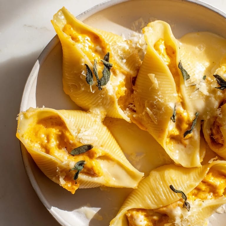 Save Luxurious jumbo pasta shells filled with a creamy pumpkin and smoked Gouda blend, baked with a rich brown butter and sage Alfredo sauce. The ultimate autumn comfort dish for festive gatherings or cozy dinners.