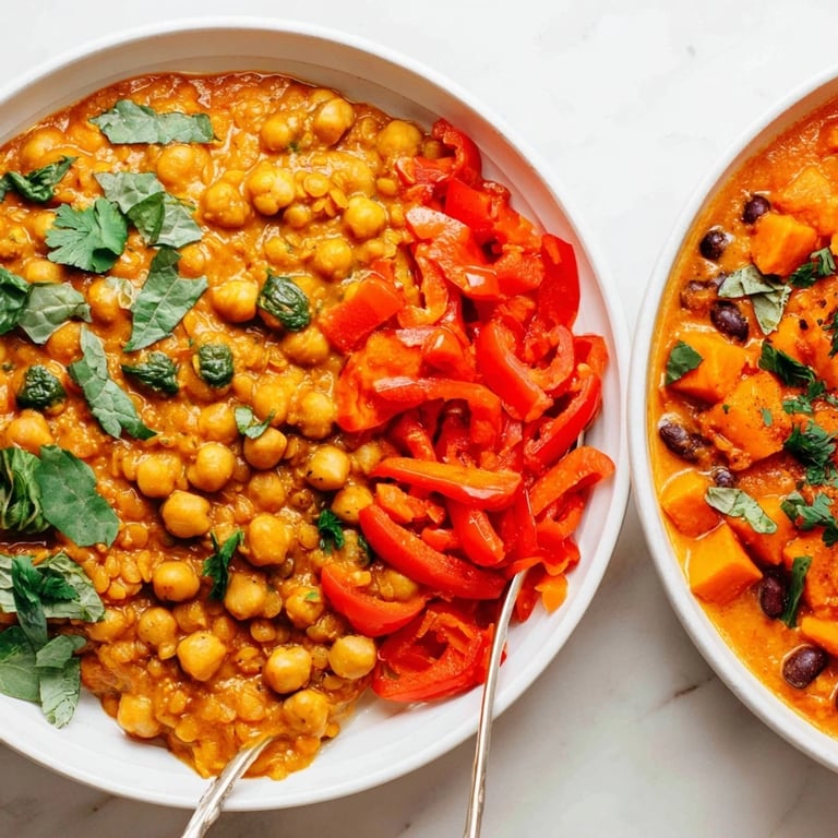 - Thai Red Lentil Curry: 2 tbsp coconut oil, 1 medium onion (diced), 3 garlic cloves (minced), 1 tbsp Thai red curry paste, 1 cup (200 g) red lentils (rinsed), 1 (14 oz/400 ml) can coconut milk, 2 cups (480 ml) vegetable broth, 1 medium carrot (sliced), 1 red bell pepper (sliced), 1 tbsp soy sauce, juice of 1 lime, fresh basil or cilantro (for garnish)