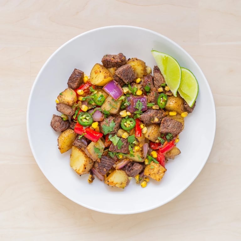 Save A hearty, flavorful one-pan dish combining tender steak, crispy potatoes, and vibrant Southwestern spices for a satisfying meal.
