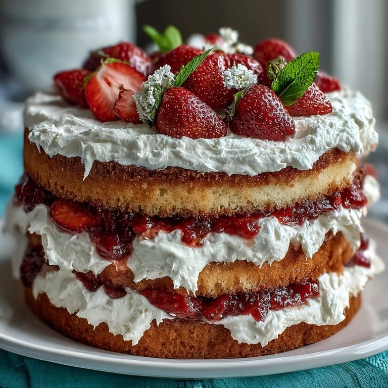I once made this cake for an impromptu backyard gathering—no special occasion, just friends with laughter ringing out before the first slice hit the plate. The fresh strawberries disappeared fast, and someone confessed they'd never seen an uniced cake look so pretty. Halfway through assembling, my youngest niece insisted on arranging mint leaves, adding her quirky touch to the already playful stack. We ended up sharing stories late into the evening, crumbs and cream smudged on napkins and noses alike. This cake really does invite connection.