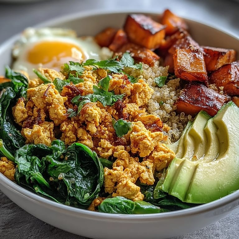 Save My neighbor knocked on my door one Saturday morning holding a crumbled block of tofu and asked if I knew what to do with it. I invited her in, pulled out my turmeric and a skillet, and we ended up making breakfast together while her kids colored at my kitchen table. That morning turned into a weekly ritual, and this bowl became our go-to because it felt like a complete meal without any fussiness. The tofu surprised her with how much it soaked up the spices, and the sweet potatoes added a natural sweetness that balanced everything. Now whenever I cube sweet potatoes, I think of her laugh when she realized vegan breakfast could be this satisfying.