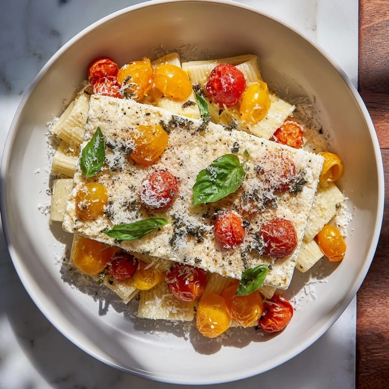 Save A festive, creamy pasta dish featuring oven-roasted feta, bursting cherry tomatoes, garlic, and a snowy sprinkle of grated Parmesan, perfect for a holiday table.