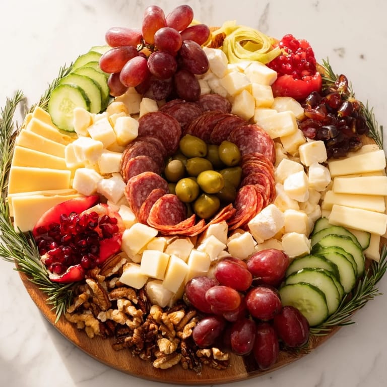 Use fresh rosemary and thyme not only for garnish but also to enhance the festive aroma of the board. Folding cured meats into rosettes adds an elegant touch and helps them blend seamlessly with the cheese clusters. Arrange fruits and accompaniments thoughtfully to create a balanced and colorful wreath with no empty spaces.