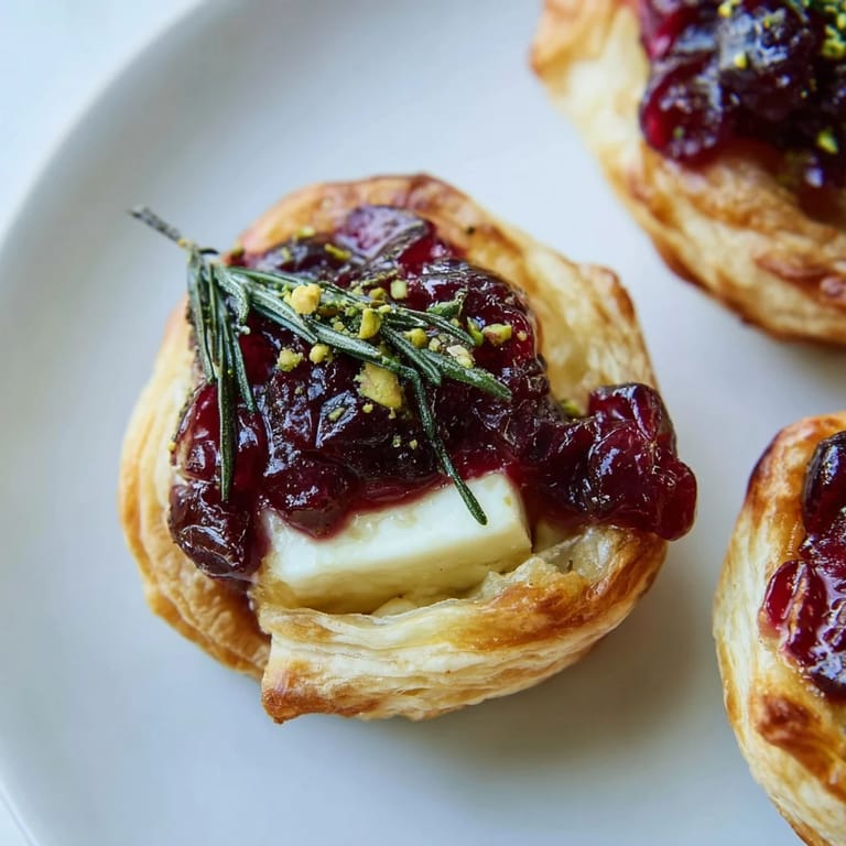 Save A festive, savory tartlet arrangement featuring creamy brie, tangy cranberry sauce, and golden puff pastry, perfect for holiday gatherings.