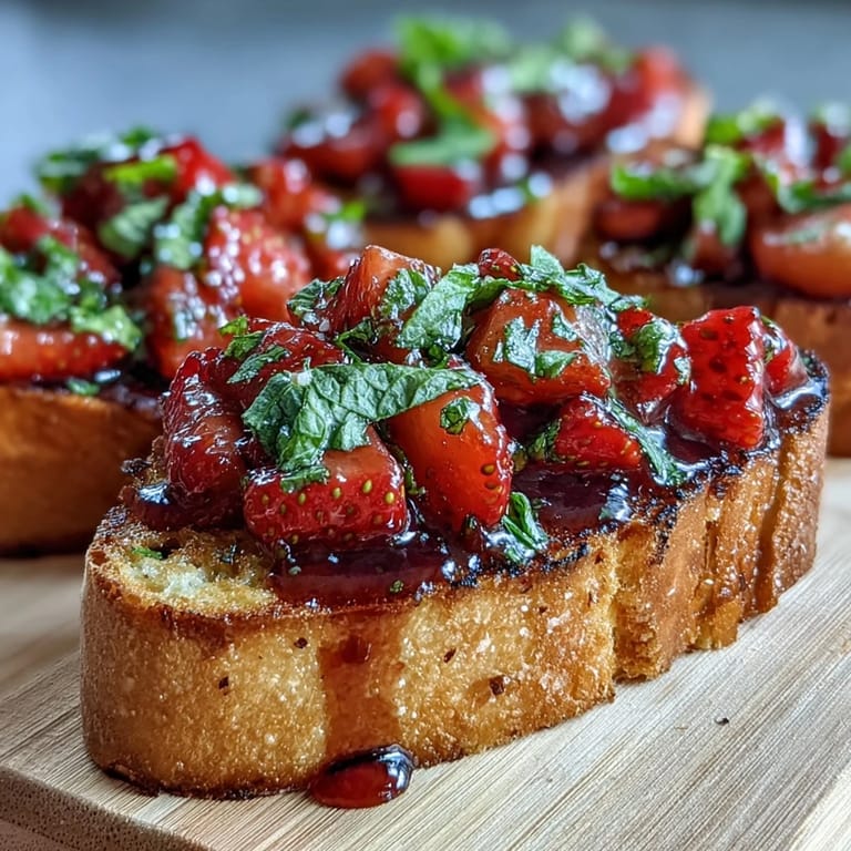 The magic of this recipe lies in its simplicity and the quality of its ingredients. Juicy strawberries are tossed with fresh mint, a touch of honey, and bright lemon zest to create a topping that's both refreshing and sophisticated. The homemade balsamic reduction adds a glossy, tangy-sweet finish that ties everything together. Each bite offers a satisfying contrast: the crunch of toasted bread, the juiciness of the berries, and the aromatic punch of garlic and mint. It's a dish that tastes like sunshine on a plate.