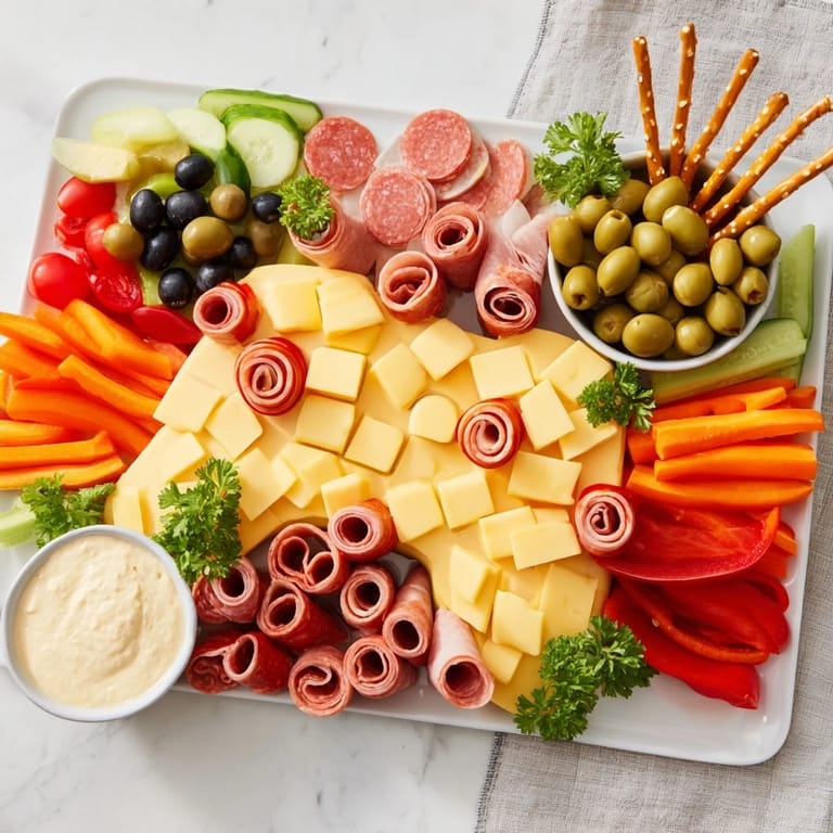 This appetizer brings together a variety of textures and flavors, making it an ideal party platter. The combination of cubed and sliced cheeses contrasts beautifully with savory meats while fresh vegetables add crispness and color. The playful arrangement invites interaction, making this platter both a conversation starter and a satisfying treat.