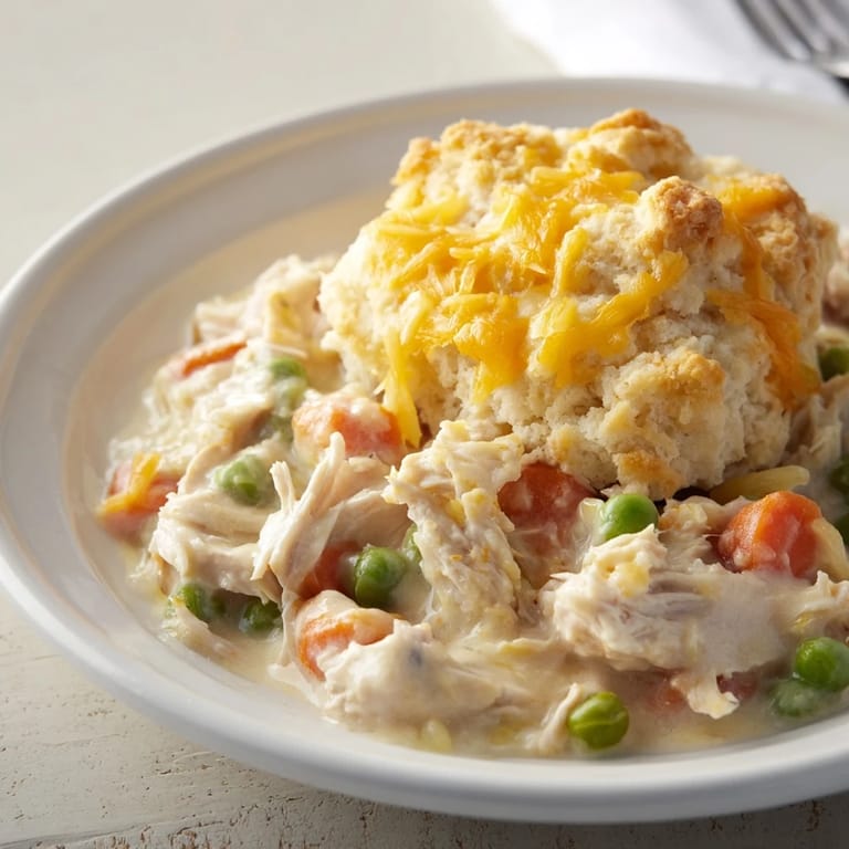 Save A comforting, savory casserole featuring tender chicken and vegetables in a creamy sauce, topped with golden, cheesy cheddar biscuits—all baked together in one pan for easy cleanup.