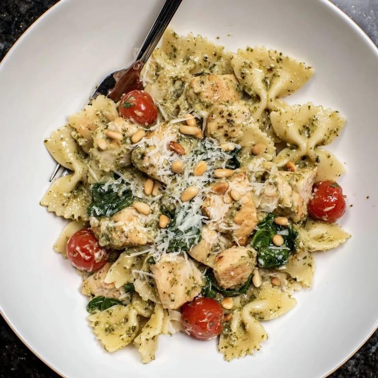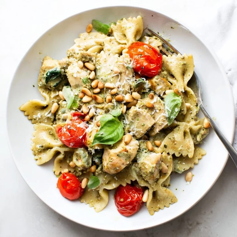 Save A vibrant, flavorful pasta dish featuring tender chicken, bowtie pasta, and a creamy basil pesto sauce—perfect for a quick weeknight dinner.