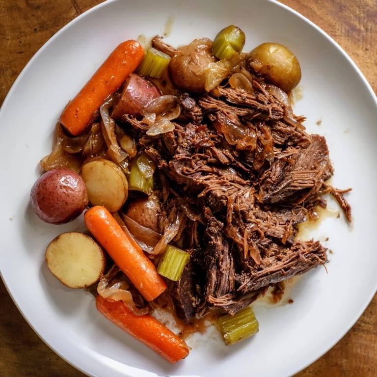 Save A succulent, fork-tender pot roast infused with tangy pickle brine and aromatic spices, delivering a unique depth of flavor and irresistible juiciness.