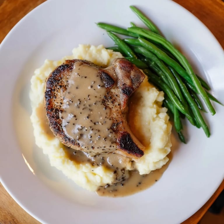 Save Juicy seared pork chops served atop creamy cheddar mashed potatoes, finished with a savory pan gravy and crisp green beans for a comforting, satisfying meal.