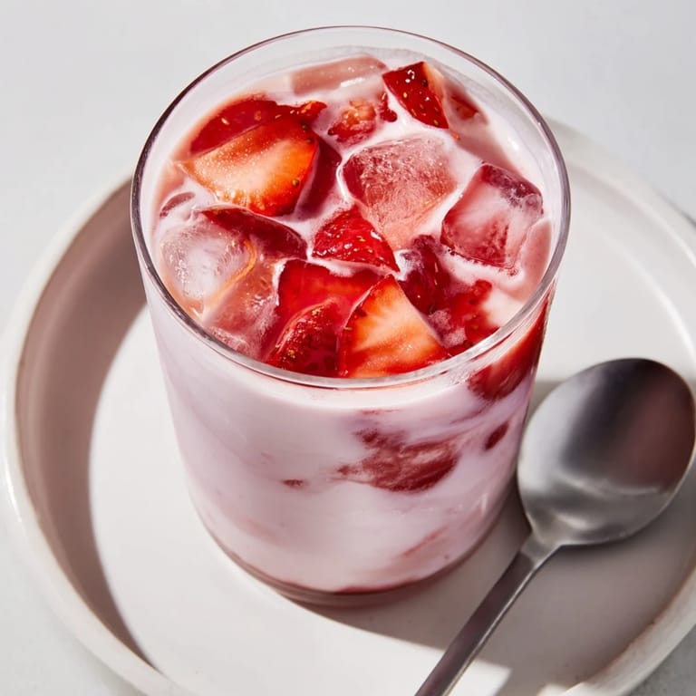 This drink is meant to be enjoyed immediately while the ice is still doing its job and the flavors are at their brightest. If you're making it for a small gathering, you can prep the syrup-milk-water mixture a few hours ahead and store it covered in the fridge, then shake it again just before serving with fresh ice and strawberries.