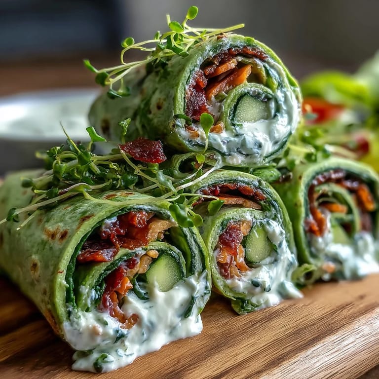 The magic of these pinwheel wraps lies in the herb cream cheese. A blend of fresh chives, parsley, and dill transforms ordinary cream cheese into an aromatic spread that's bursting with flavor. A hint of garlic and a squeeze of lemon juice add depth and brightness, while the creamy texture acts as the perfect binding agent to hold all those colorful vegetables in place. The spinach tortillas not only add nutritional value but also create that eye-catching green spiral that makes these wraps so photogenic. Each bite offers a delightful contrast of textures—the soft, herb-flecked cheese against the crunch of fresh carrot, bell pepper, and cucumber—making every pinwheel a perfectly balanced mouthful.