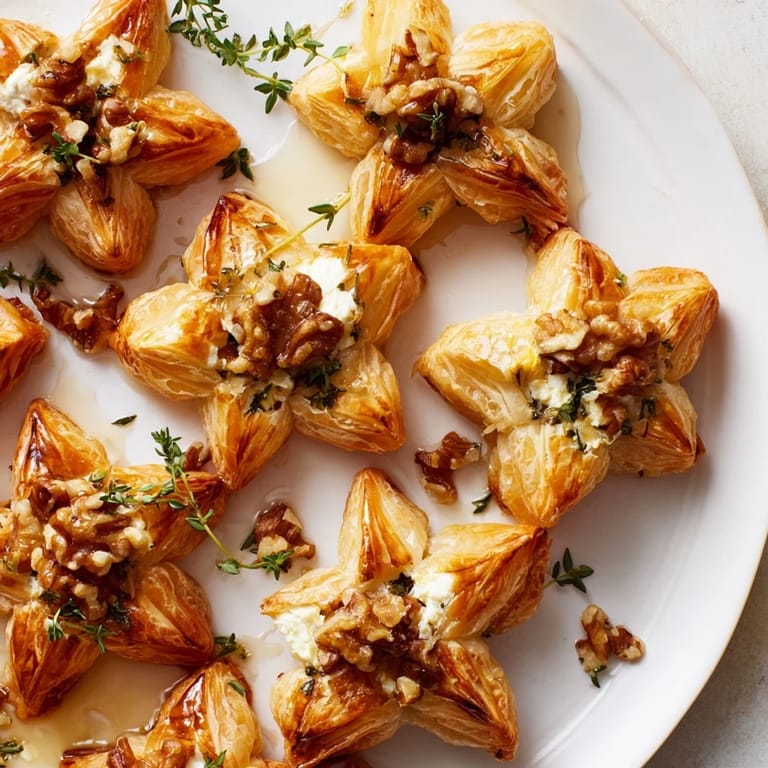 - Star-Shaped Puff Pastry Bites: 1 sheet puff pastry thawed , 1 egg beaten (for egg wash) , 50 g goat cheese softened , 2 tbsp honey , 2 tsp fresh thyme leaves , 1/4 cup chopped walnuts