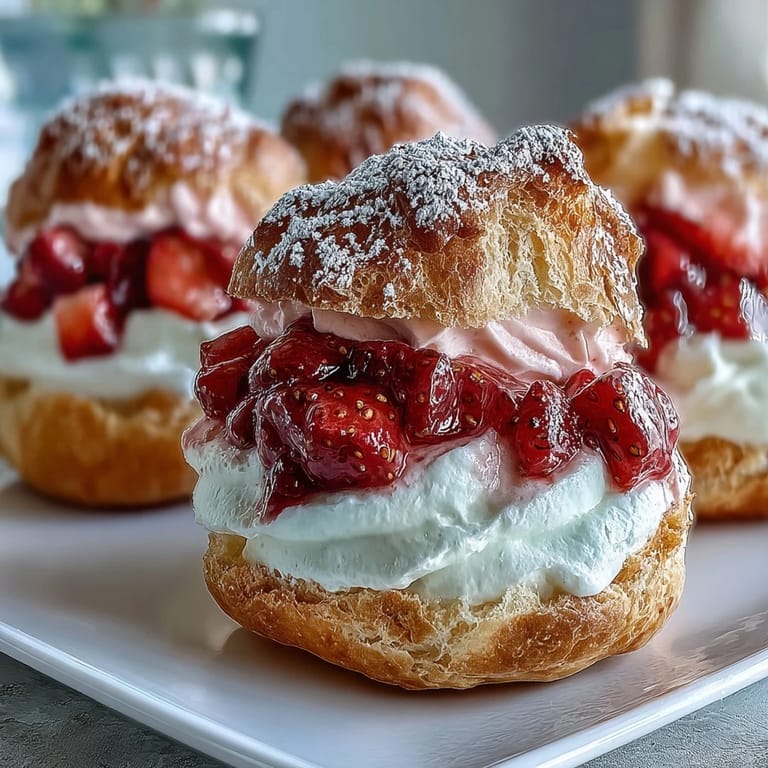 Save There's something about the way cream puffs puff up in the oven that still catches me off guard, even after making them a dozen times. My partner surprised me with strawberries on Valentine's Day a few years back, and instead of the typical chocolate dessert, I found myself wanting something lighter, more delicate—something that felt like an actual celebration rather than an obligation. That afternoon, I piped these little mounds of choux onto parchment paper, and watching them transform into golden clouds felt like small magic happening in my kitchen. The combination of crispy shells giving way to clouds of strawberry-kissed cream became something we looked forward to every spring after that.